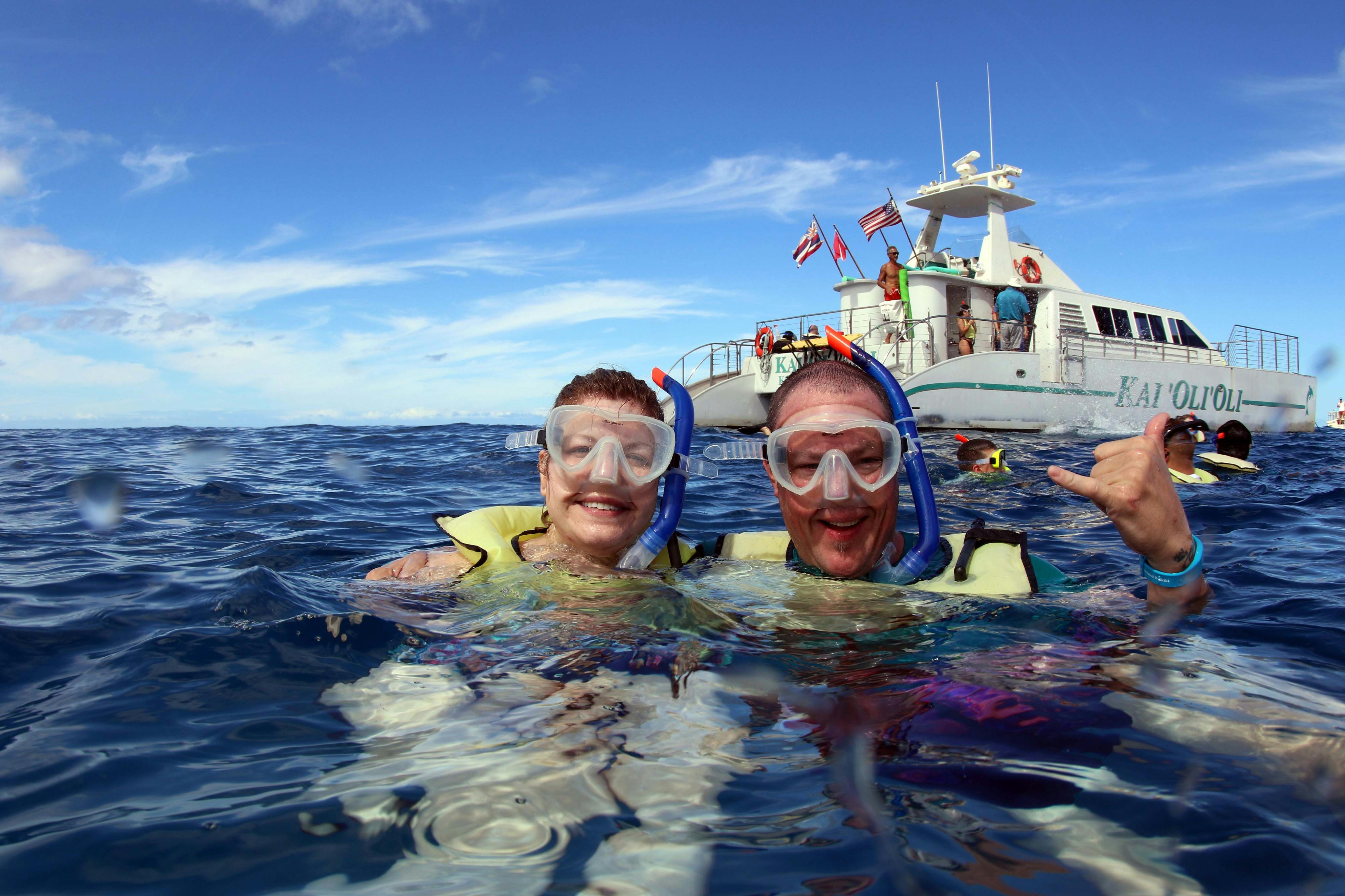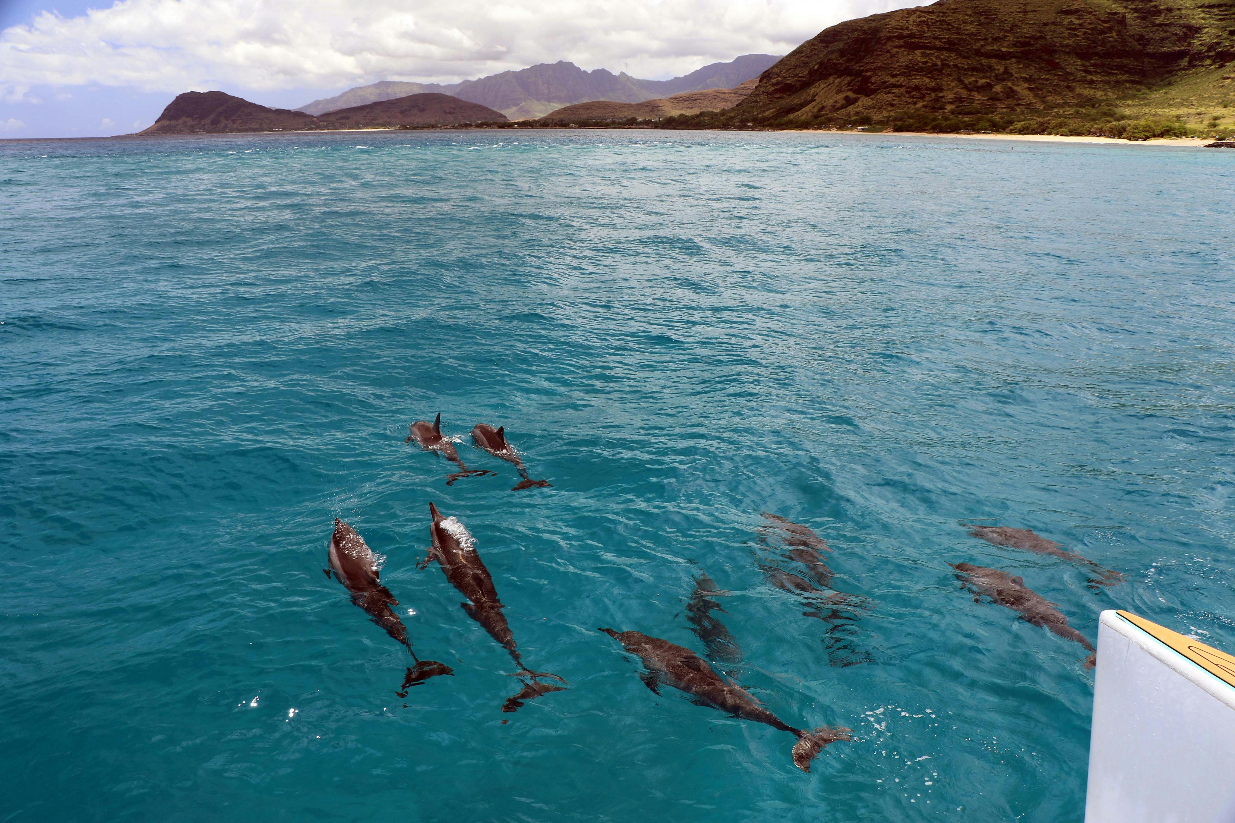 Afterwards, head to Ko Olina Marina to board the boat for a dolphin-watching cruise. While onboard, enjoy the views from the spacious cabin or the open-air deck.