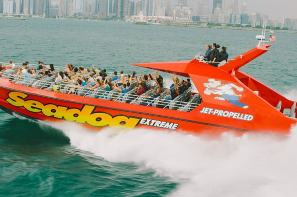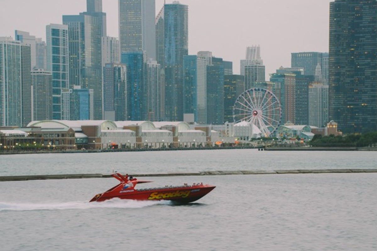 With exhilarating high speeds and full 360° spins, get ready to blast off on the jet-propelled Chicago Seadog Extreme Thrill Ride. Experience full-throttle slalom runs, sharp twists and turns, and crashing waves while your speedboat tour takes you around Lake Michigan. Dress appropriately – getting wet is a guarantee! The enthusiastic and expert crew tells the story of the Windy City as you zoom past some of Chicago's most iconic sites, like the Willis Tower, Buckingham Fountain, and Grant Park. Perfect for thrill-seekers 48" and taller, this speedboat tour will activate your need for speed.