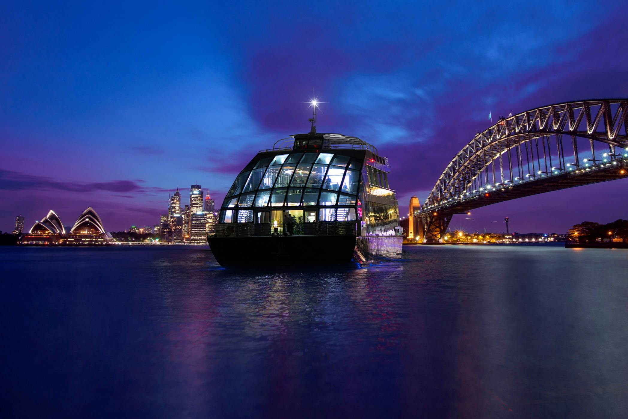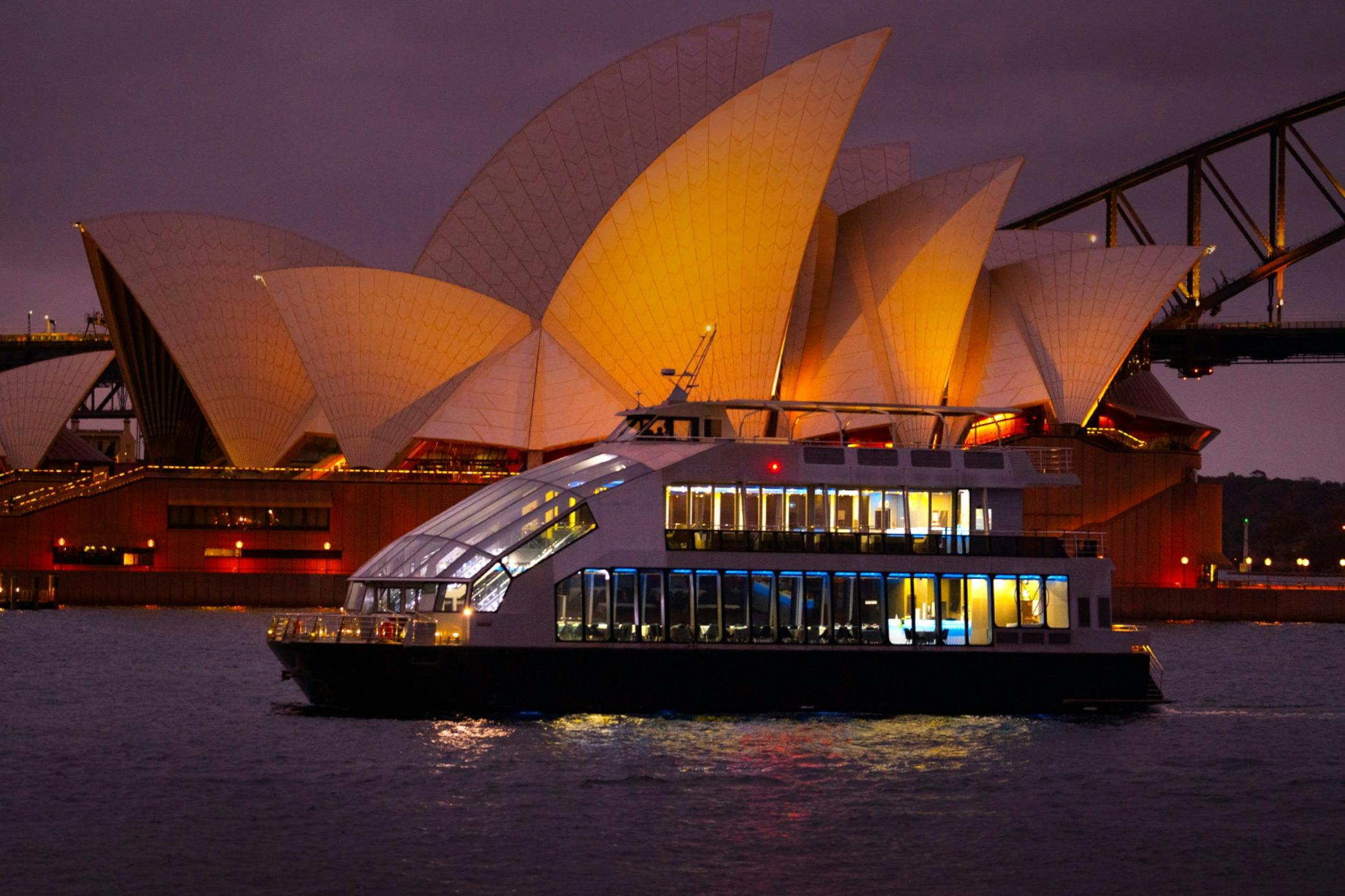 Board a glass boat at Sydney Harbour and take part in a dinner cruise with unobstructed views. This cruise includes a multi-course dinner alongside carefully chosen wines, while showcasing views of the Harbour Bridge, the Opera House, and the cityscape. View these landmarks while seated on this nighttime harbour voyage.