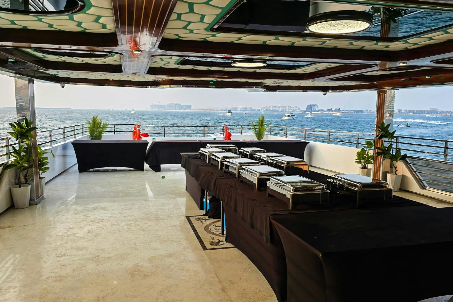Set sail on a megayacht in Abu Dhabi, featuring a swimming pool. Enjoy a sightseeing cruise with a buffet dinner. Navigate the yacht and view notable sights of Abu Dhabi's skyline, including Yas Marina.
