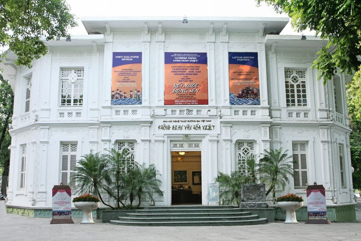 Visit the Lotus Water Puppet Theater along Hoan Kiem Lake. The building combines French architecture with Vietnamese artistry.